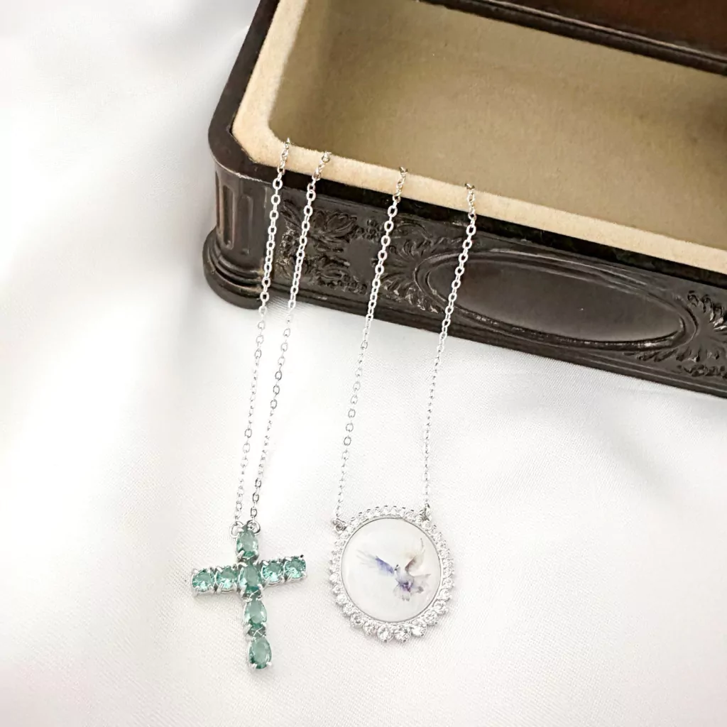 Colar do tipo escapulário com 32 cm de extensão e dois lados: Medalhão em Madrepérola com aproximadamente 2,54cm de diâmetro com a imagem do Divino Espirito Santo e cravação em zircônias cristais em volta e Crucifixo cravejado com aproximadamente 2,60cm de altura x 2,16 de largura. Você escolhe qual lado usa para frente e para trãs.